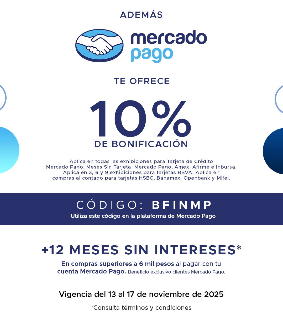 MERCADO PAGO TE OFRECE 10% DE BONIFICACIÓN + 12 MSI EN COMPRAS SUPERIORES A 6 MIL PESOS (13 AL 17 DE NOVIEMBRE)